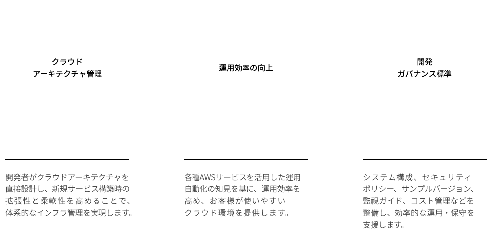 • 運用効率の向上 : AWSの各種サービスを活用して、管理業務を自動化した経験を基に、運用効率を高め、顧客が簡単に利用できるクラウド環境を提供します。